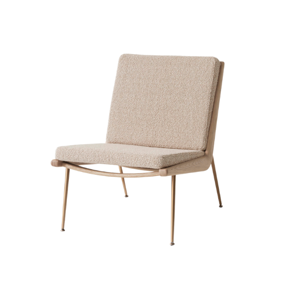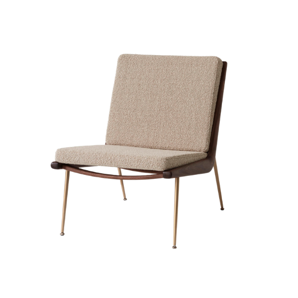 Boomerang HM1 loungestol, designet af Hvidt & Mølgaard for &Tradition, debuterede i 1956 og er et ikon inden for dansk møbeldesign. Stolen har en strømlinet og elegant form, hvor den smukke træramme kombineres med enkle, slanke ben i messing, hvilket gør Boomerang HM1 til et tidløst mesterværk.