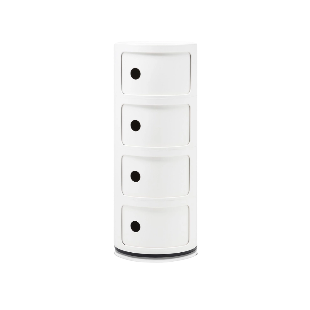 Det smarte opbevaringssystem Componibili 4-rum af den italienske virksomhed Kartell. Den tyndeformede konstruktion har 4 rum der kan åbnes uafhængigt af hinanden og der er god plads til opbevaring på toppen.