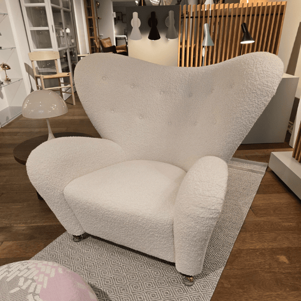 Oplev en sjælden mulighed for at få fingrene i Audo Copenhagens relancering af Flemming Lassens ikoniske lænestol Den Trætte Mand – her som en smukt vedligeholdt udstillingsmodel.